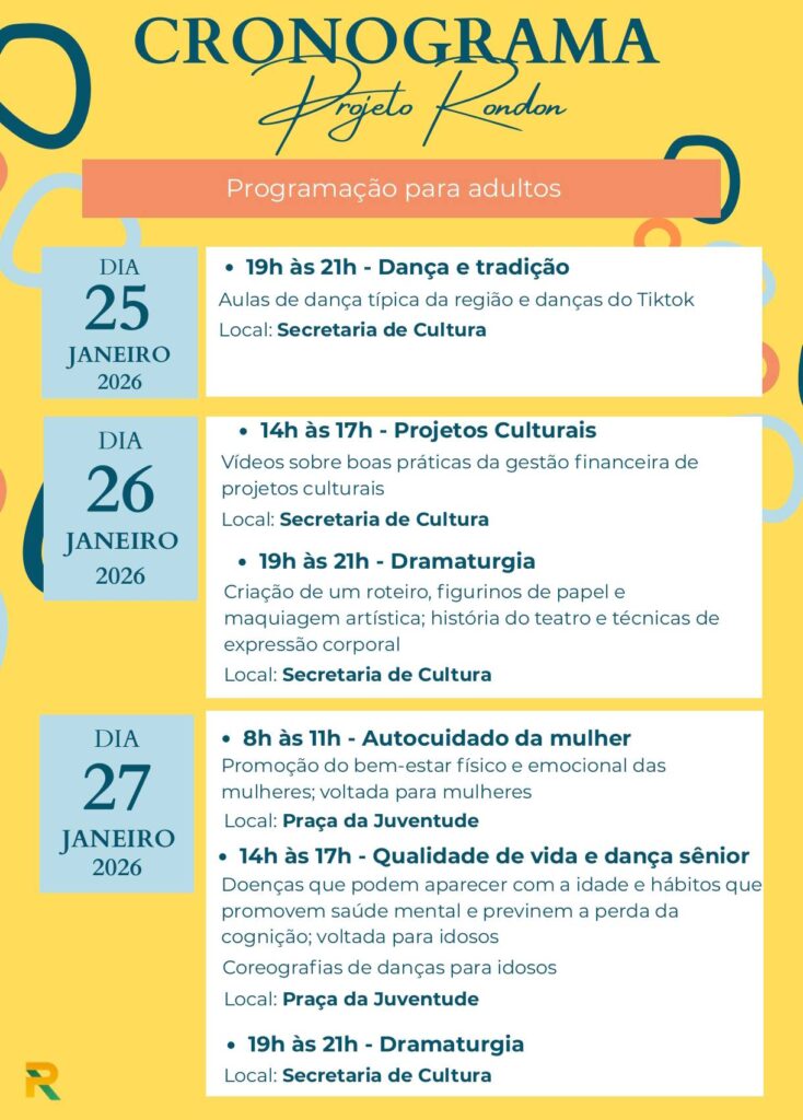 Luiziana vai receber, entre os dias 25 de janeiro e 3 de fevereiro, uma programação especial do Projeto Rondon, com diversas oficinas, atividades culturais e ações educativas voltadas para jovens, adultos, mulheres e idosos. As atividades acontecem principalmente na Secretaria de Cultura e na Praça da Juventude, e são abertas à comunidade. A iniciativa tem […]