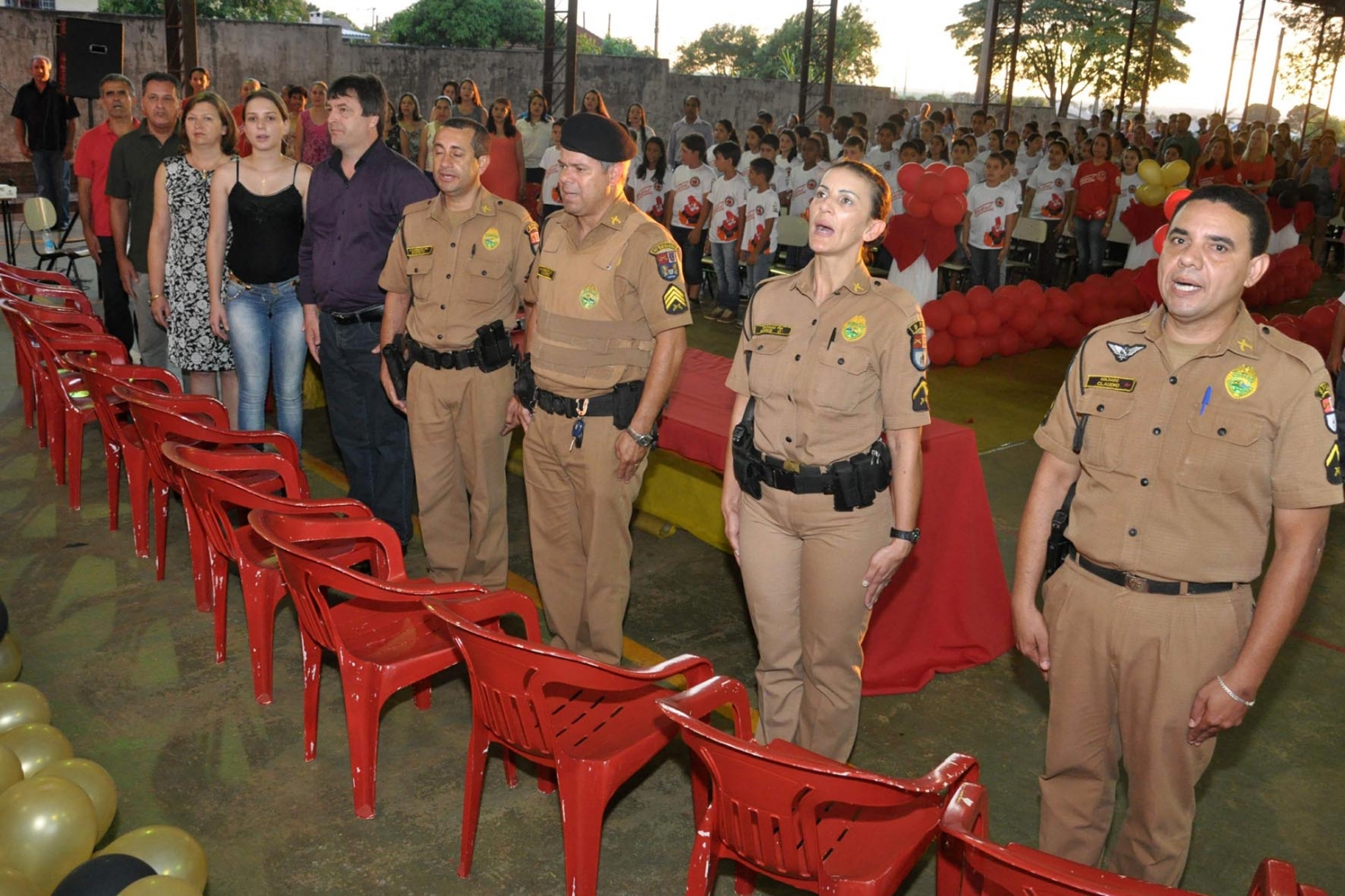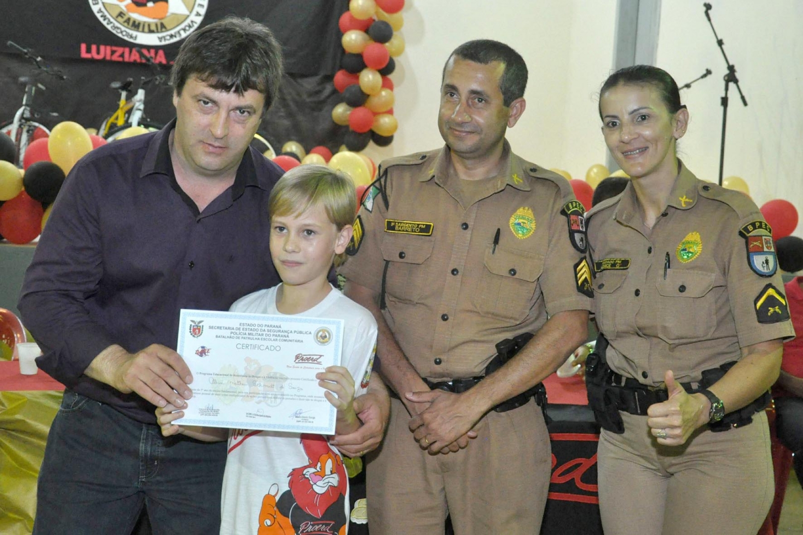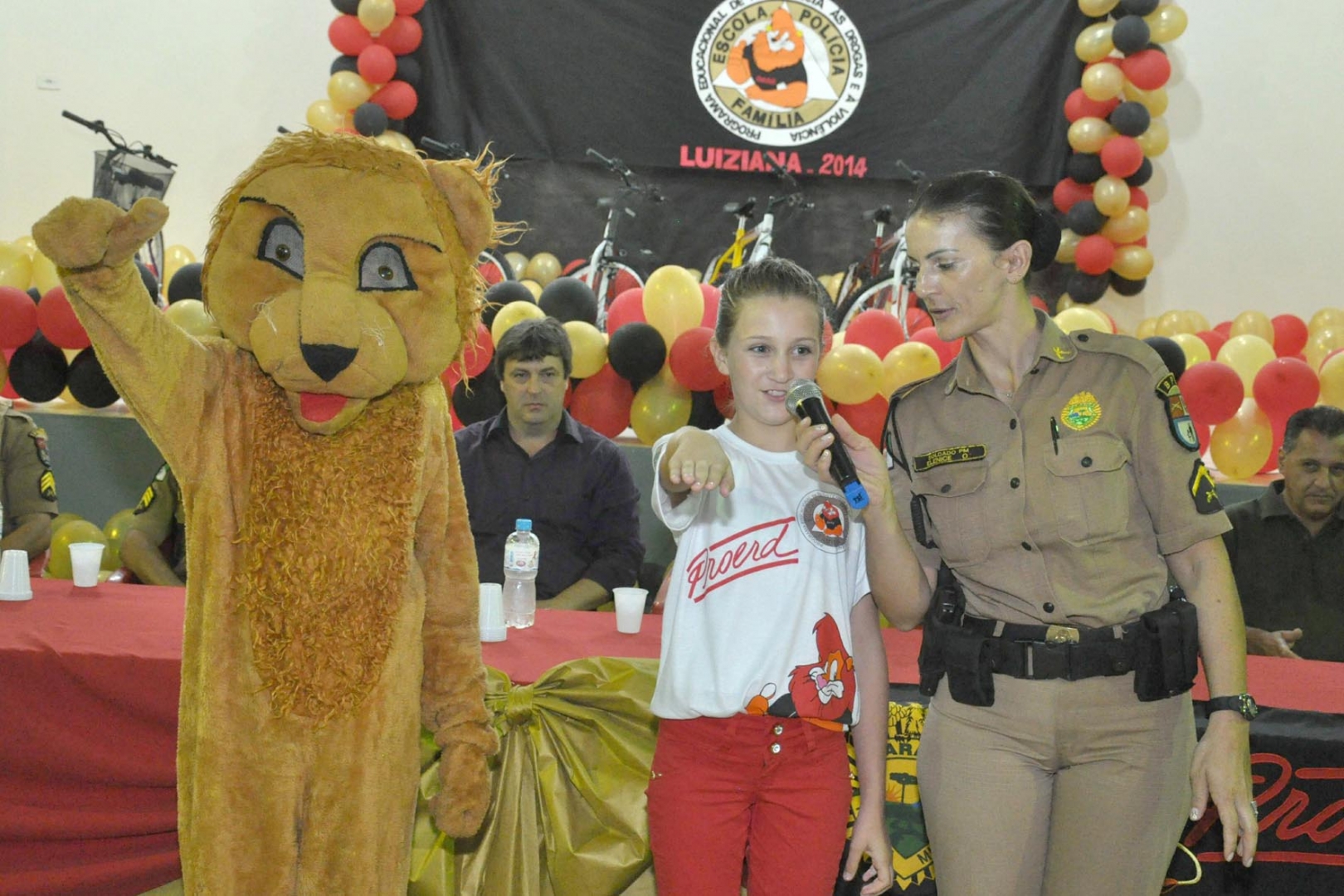 Estiveram participando do evento, o prefeito de Luiziana Mauro Alberto Slongo, a vice-prefeita Tide Faria, o vereador Pedro Faria representando a câmara de Vereadores, a secretaria municipal de educação Cleonice Dallapola de Brito, o diretor da escola Rita de Cássia Adilson Diniz Medeiros, diretor do colégio estadual Adaucto da Silva Rocha professor Adilson Maria de Oliveira, o comandante do destacamento de Policia de Luiziana sargento Valdecir José de Miranda, representando o comandante do 11º BPM sargento Luciano Barreto, além dos instrutores do PROERD de Araruna, soldado Marcelo Takeda e do soldado Claudio Monteiro da Silva instrutor de Juranda.