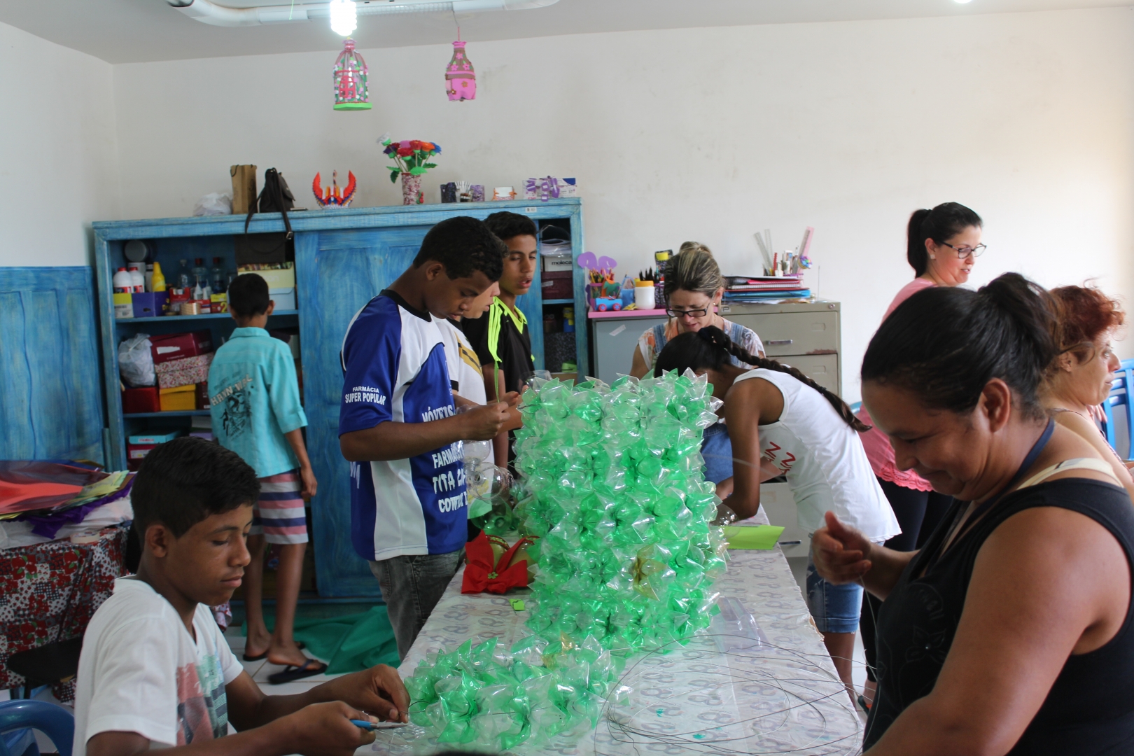 Nessa semana teve inicio as oficinas para confecção de guirlandas e sinos que servirão de enfeites nas arvores do Calçadão Romão Martins, aos poucos o que eram apenas garrafas pet começaram a ser transformados em lindas peças que trazem junto muita dedicação e amor. Uma equipe da Secretaria de Cultura e do Serviço de Convivência e Fortalecimento do Centro de Referência da Assistência Social (Cras) que tem a participação e adolescentes e adultos que fazem parte do CRAS e de voluntários trabalha em ritmo acelerado. “Esse ano tivemos a idéia de criar o projeto “Natal de Luz” para estimular a consciência de sustentabilidade nas pessoas, mostrando que é possível fazer algo bonito com materiais recicláveis”, disse a coordenadora do CRAS Neide Candido.