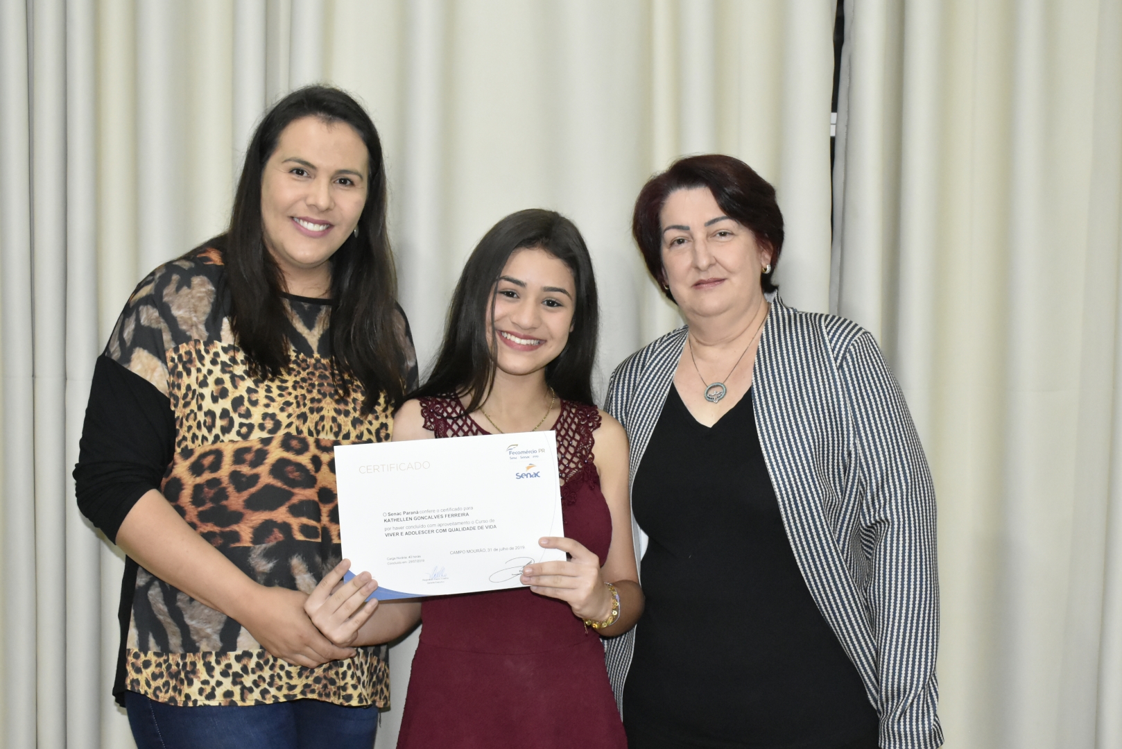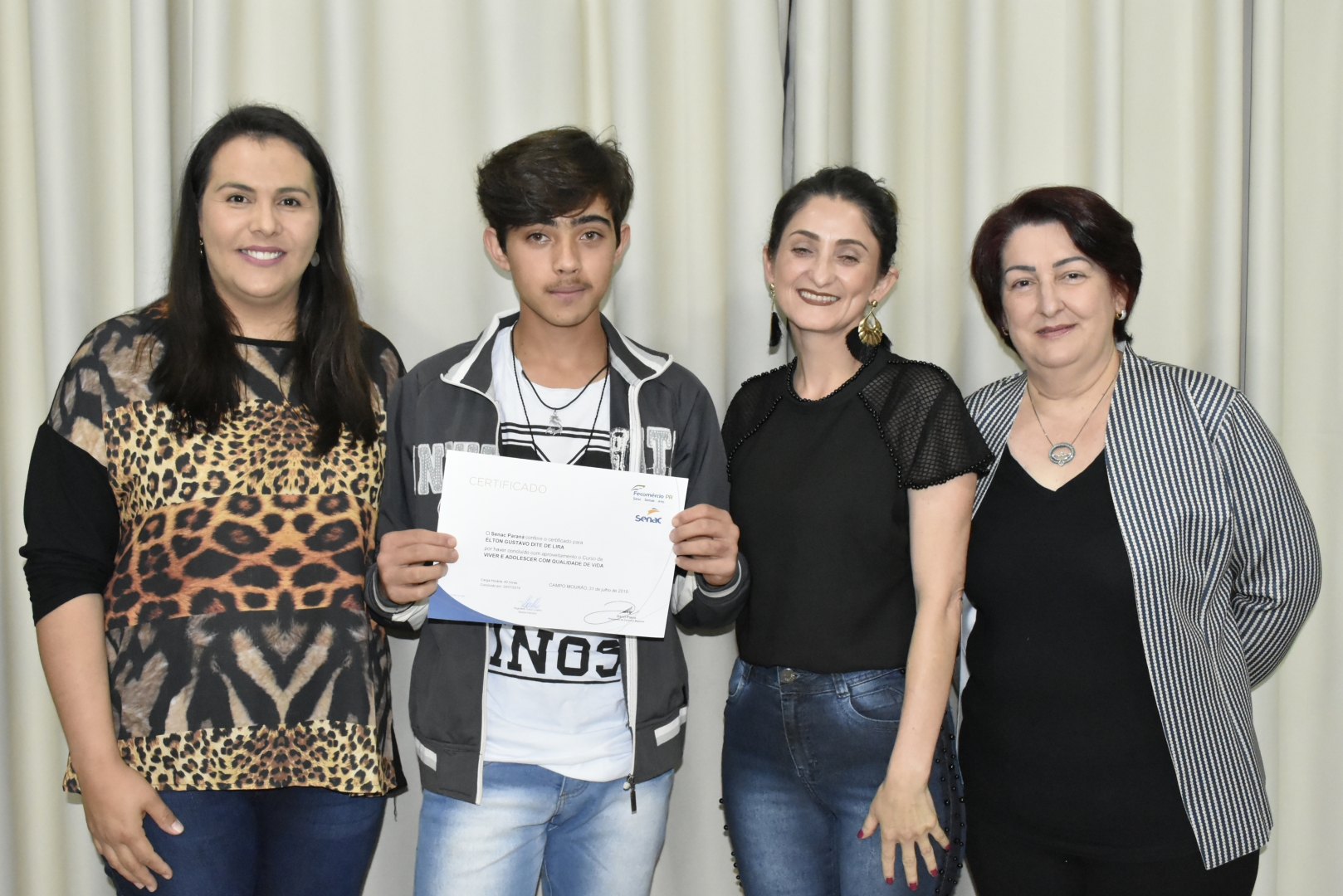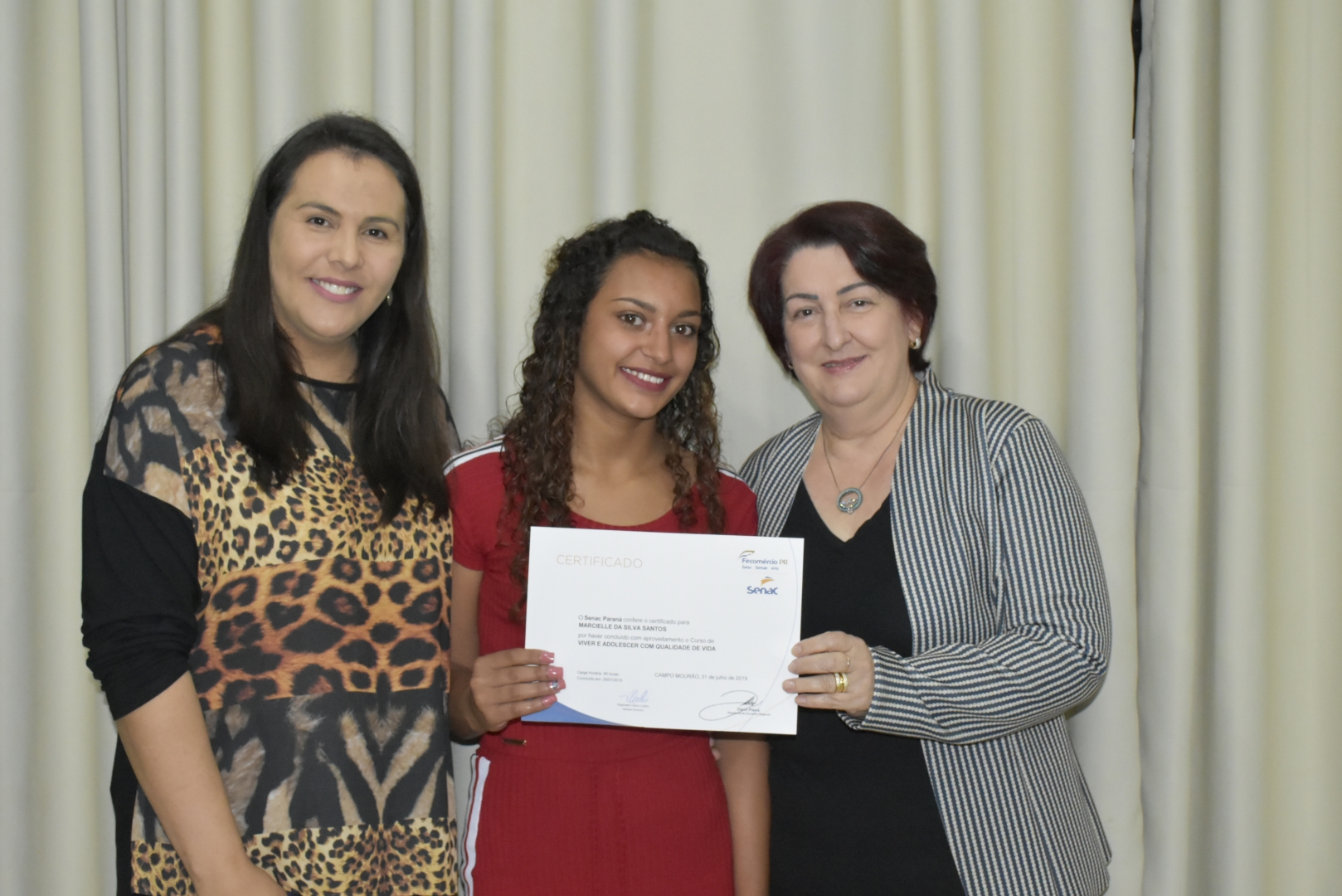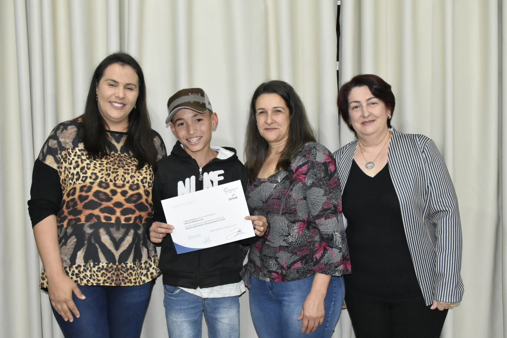 O encerramento do curso teve a presença da Secretaria de Ação Social, Letícia Monteiro, gerente executivo do Senac Reginaldo Inácio com sua equipe, a coordenadora do CREAS Noeli Tureck, a coordenadora do CRAS Cleide Rufino, a Presidente do Conselho Tutelar Lucimar Santana, o instrutor do curso Luciano Garcia Ramos e demais convidados como pais e familiares.