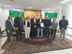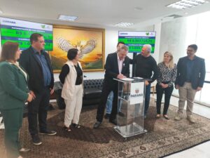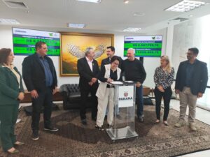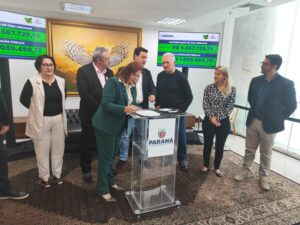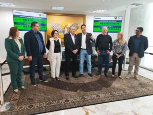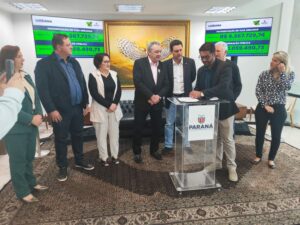 O prefeito de Luiziana Wilson Tureck, acompanhado da primeira dama Noeli Tureck, do vice-prefeito Marcio Fin e esposa Rosana Fin, ex-prefeito de Campo Mourão e ex-deputado estadual Nelson Tureck, assessor jurídico Luan Drancka, e do secretário de planejamento Marcio Rosa, estiveram na manhã de quarta-feira (12) no Palácio Iguaçu em Curitiba, para a assinatura do Convênio Asfalto Novo, Vida Nova, com o governador Ratinho Junior.