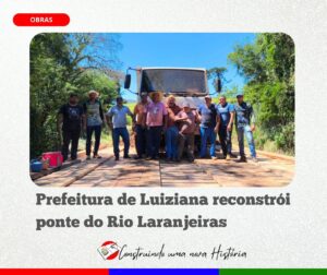 A Secretária de obras de Luiziana trabalhou com urgência neste final de semana para reconstruir a ponte do Rio Laranjeiras, na Comunidade de Valinhos. A antiga estrutura estava deteriorada e oferecia riscos para a quem transitava pela estrada. Após dois dias de trabalho intenso, a nova ponte foi liberada na manhã de domingo (09).